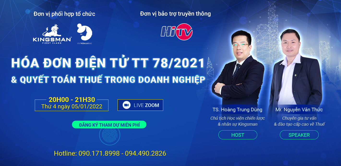 Vừa qua, Học viện Kingsman đã tổ chức thành công chương trình “Hóa đơn điện tử TT 78/2021 và Quyết toán thuế trong doanh nghiệp” dành cho cộng đồng. Chương trình thu hút được hơn 300 khách mời tham dự với sự tham gia của 02 diễn giả chính là TS. Hoàng Trung Dũng (Chủ tịch Học viện Chiến lược và Nhân sự Kingsman) và chuyên gia Nguyễn Văn Thức (Chuyên gia đào tạo cao cấp của Kingsman, Thành viên Hội tư vấn thuế Việt Nam, Nguyên thanh tra Thuế của Tổng cục Thuế).